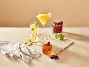 inside Rooh Nashville's dining room with a well lit bar and dining area - round modern tables and chairs plus bench seating with rectangle tables and light colored flooring